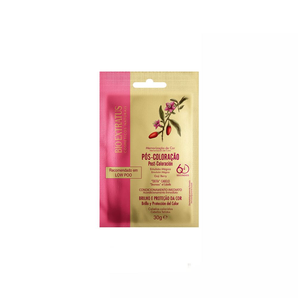 Modo de usar: após lavar os cabelos com shampoo, aplique a dose da Memorização da Cor por toda a extensão dos fios, massageando suavemente. Deixe agir por 60 segundos. Use também os outros produtos da linha Pós-Coloração.