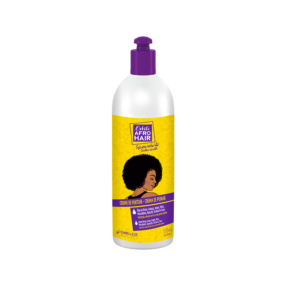 Enriquecido com Óleo de Rícino, Linhaça, Argan, Oliva, Macadâmia, Abacate, Girassol e Coco, O Creme de Pentear Estilo AfroHair hidrata, reduz o frizz e as pontas duplas, e deixa os caracóis soltos e definidos.